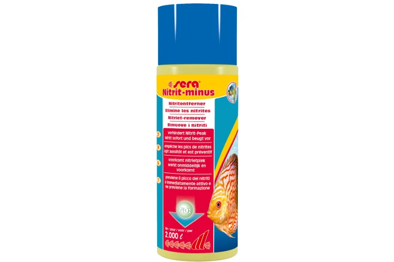 Während der Einfahrphase eines neuen Aquariums, nach einem Filterwechsel oder auch nach einer Arzneimittelbehandlung besteht die Gefahr, dass sich Nitrit im Wasser anreichert – es zu einem Nitritpeak kommt – da (noch) zu wenige Filterbakterien vorhanden sind, um das giftige Nitrit in den Pflanzennährstoff Nitrat umzuwandeln. Schon ein Nitritwert von 1,0 mg pro Liter Aquarienwasser kann schädlich für Ihre Fische sein. Sera Nitrit-minus leistet bei akuter Belastung schnelle Hilfe und entfernt sofort bis zu 1,5 mg/l Nitrit pro Dosierung. Bei diesem Vorgang wird das Nitrit in organische Amine umgewandelt die von den Filterbakterien verwertet werden können. Sera Nitrit-minus ist für alle Aquarienbewohner – Zierfische, Wirbellose und Pflanzen – sehr gut verträglich und Sie können unbedenklich bis zum 5-fachen der Dosierung anwenden.